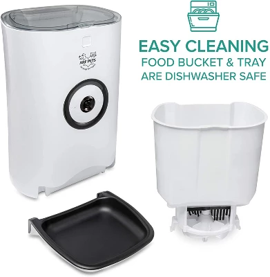 Feeding control in the palm of your handNever wake up early or rush home to feed your pet again. The Arf Pets Smart Automated Pet Feeder with Video Camera lets you build a customized eating schedule to keep your pet happy even when you’re away.Our easy-to-use smartphone app lets you control every aspect of your feeder. Build your pet’s feeding schedule and view past feedings to ensure your feeder is working simply and easily.Connect with your pet from anywhereEver wish you could bring your pet with you everywhere? Now, your pet is never farther than your pocket.This smart feeder allows you to check in on your pet from anywhere. Watch live video, record their cutest moments, and even let them know how much you love them with two-way audio.