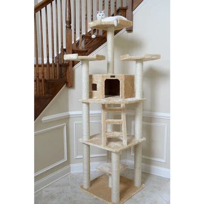 - 80″ height, Multi-function Cat Tower, Beige with high density faux fur covering for felines comfort and soft, coverings are permanently adhered to wood structures.