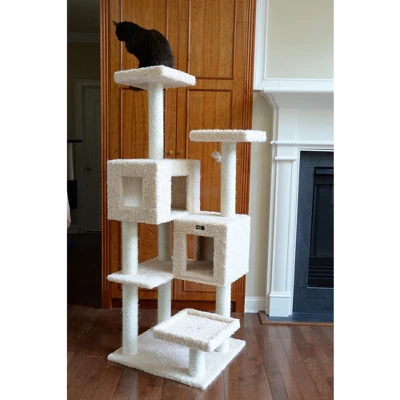 Armarkat model no. A6702 is cat daddy approved by noted cat behaviorist Jackson galaxy and features 2 cat playhouses, perches, sisal 100% cured sisal rope for “scratch ability.” a tunnel playhouse, hammock, hanging ball toy and sisal rope toy, and multiple perches for your cats enjoyment. F and B Bullet: Covered with ultra-thick beige faux plush for felines’ comfortAll coverings are permanently adhered to wood board which sustains long lasting scratching. Well constructed of 15mm pressed wood material, making it not only thicker but stronger. 100% Natural, seasoned sisal rope wraps all posts securely for years of “scratch ability.” Dimensions:post diameter: 3.5″; base dimension: 26″ x 24″; playhouse dimension: 14″(L) x 14″(W) x 13″(H); 14″(L) x 20″(W) x 13″(H); perch Dimensions:14″ x 14″. Max holding weight: 60 lbs. Six-month warranty included. Replacement parts available from the manufacturer.
