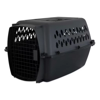 The Aspen Pet Porter keeps pet safe and secure for travel and transport while giving pet owners peace of mind. The heavy-duty plastic shell and metal screws provide safety and protection for your pet. The doors durable, easy-open latch allows pet parents to open the kennel conveniently with one hand. Pets can travel comfortably in the kennel with plenty of air and visibility via the ventilation openings. The lightweight design of the travel dog crate allows pet parents to travel with ease. The plastic material of the kennel is easy to clean and wipe down. The Pet Porters simple metal hardware allows easy assembly. The travel kennel has additional features that are offered depending on size, featuring carrying handles, back vents, compartment covers, and side latches for the smaller sizes and secure, tie-down holes for the larger sizes.