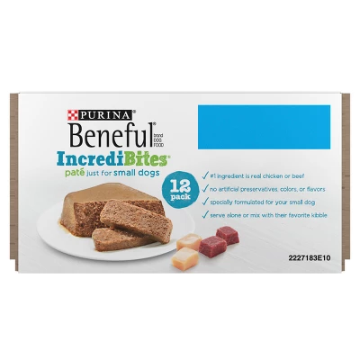 Delight your dog with a Beneful IncrediBites Pate Small Dog Wet Food Grilled Chicken Flavor and Filet Mignon Flavor in a Savory Gravy Variety Pack. Each dog food tray includes real chicken or beef as the number one ingredient, with 100 percent complete and balanced adult dog nutrition. These tasty small dog food recipes have a dog food soft texture that’s perfect for small mouths to chew. Give your dog the nutrition they need with a Beneful IncrediBites Pate Small Dog Wet Food Grilled Chicken Flavor and Filet Mignon Flavor in a Savory Gravy Variety Pack.