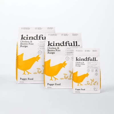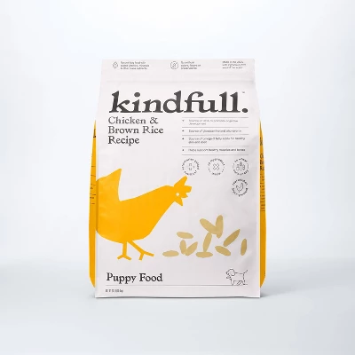 Kindfull™ Chicken & Brown Rice Recipe Dry Puppy Food is made with real chicken as the first ingredient and contains high-quality protein. This formula is a source of DHA to promote cognitive development. The formula also contains glucosamine, chondroitin, as well as omega-3 fatty acids for healthy skin and coat. This formula also supports muscle and bone development for your puppy. When introducing a new diet to your pet, please transition over 7 days as indicated. Food intake requirements vary depending on age, activity and environment, and should be adjusted accordingly to maintain optimum body condition..