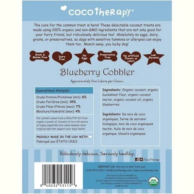 Perfectly sized for training, small dogs, or figure-conscious dogs. Approximately 1 calorie per treat, coco-charms are made using 100% organic and non-GMO Ingredients that are not only good for your furry friend, but ridiculously delicious too. Absolutely no eggs, dairy, grains, or preservatives, so dogs with sensitive tummies or allergies can enjoy them too. Cocotherapy coco-charms are vegan, grain and gluten free, dairy Free, No eggs, and Made with no preservatives, colors, or artificial flavors. This means dogs with allergies and sensitive tummies can enjoy them and benefit from them as well. Ingredients: Organic Coconut, organic buckwheat flour, organic Coconut nectar, organic Coconut Oil, organic Blueberries. All ingredients are 100% human grade, 100% USDA Certified Organic, and non-GMO.