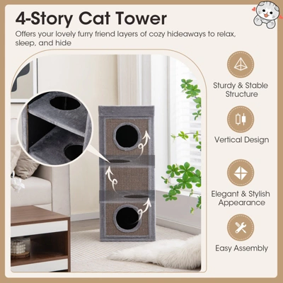 - 4-Story Cat Tower: The cat house measures 16” x 16” x 39” (L x W x H) and comes with 4 stories, offering your lovely furry friend layers of cozy hideaways to relax, sleep, and hide. And there exist 3 outer entrance holes and 2 inner holes, allowing cats to jump up and down seamlessly.