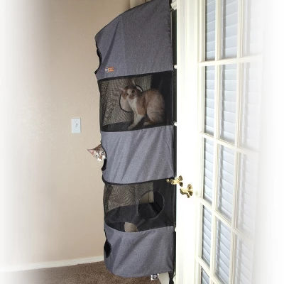 The K&H Hangin’ Cat Condo is available in two sizes, the modest 3-story Cat Condo and the 5-story High Rise Cat Condo. The High Rise is the ultimate for fun and relaxation. Designed with mesh windows on two levels of the five levels allows cats to lookout. The incredible space-saving design simply attaches to any door. No more valuable floor space is taken up by bulky cat trees and cat furniture. The 3-story Condo is not only beautiful but is also functional. With top and bottom straps to securely lock the condo in place, it provides rigid security for your cats most ambitious playtime. A mesh window on the middle level allows cats to lookout. This 3 story Hangin Cat Condo also was designed with a comfortable lounging or sleeping surface on the top. One year limited warranty.