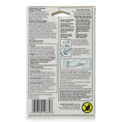 Directions: Remove one applicator tube from package and hold in an upright position away from your face. Twist dispensing tip clockwise about 1/2 turn while pushing down to break the tube’s seal. Do not remove the dispensing tip. Position the tip of the tube at the base of the pet’s back between the shoulder blades and squeeze out the entire contents of the tube to form a stripe as you move from the shoulder blades along the back to the base of the tail. The treated area may appear oily after application. Repeat every month. Consult a veterinarian before using this product on debilitated, aged or medicated pets. If signs of sensitivity occur, bathe your pet with mild soap and rinse with large amount of water. If signs continue, consult a veterinarian immediately.