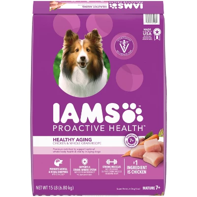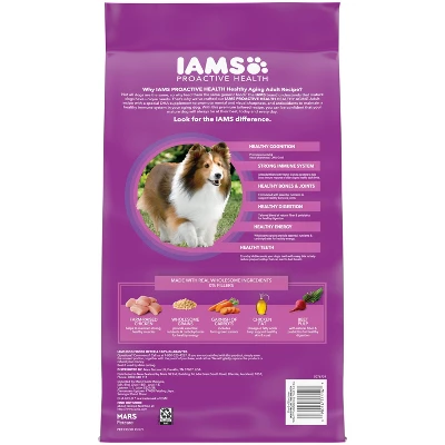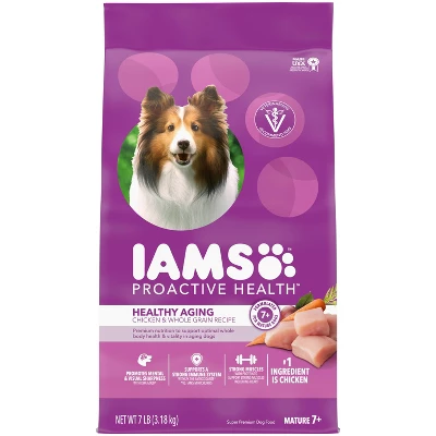 Maintain your dog’s overall health with the Proactive Health Mature Adult Dry Dog Food from IAMS. Formulated for dogs over seven years old, this dry food for dogs includes a delicious blend of real chicken, wholesome grains and beetroot pulp to provide a nutritious meal to your canine friend. Free from soy, wheat, fillers or artificial flavors, this dry chicken dog food is loaded with proteins, vitamin E, antioxidants and other essential nutrients to support your dog’s joint, immune and digestive system health.