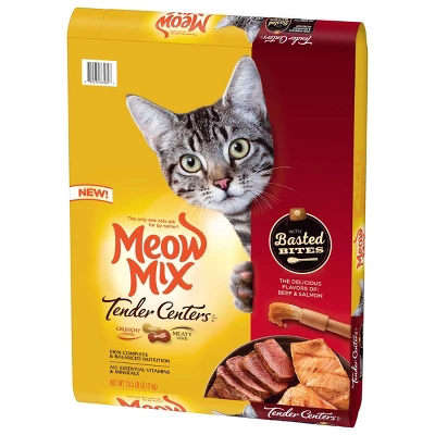 What’s the best crunchy cat food to a cat? The kind that’s also tender and meaty. This Meow Mix Tender Centers Basted Bites Dry Cat Food is no ordinary cat kibble. It combines the best parts of wet and dry cat food. The delicious flavors of beef and salmon meet two enticing textures: a crunchy outer layer and a soft, meaty center. Basted Bites add even more irresistible flavor. And because every serving provides 100% complete and balanced nutrition, including all essential vitamins and minerals, this Meow Mix dry cat food makes meeting your cat’s dietary needs more satisfying than ever.