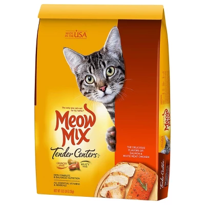 Your furry feline friend will come running when they hear the sound of this Tender Centers Salmon & White Meat Chicken Flavors Dry Wet Cat Food from Meow Mix being poured into their bowl. This bag of dry cat food has a medley of ingredients your cat is sure to love — it has the flavors of salmon and white meat chicken, along with essential vitamins and minerals. With a crunchy outside and a meaty inside that’s enticing to all cats, this tender-center dry cat food also promotes a strong immune system, joint health, digestive health and a healthy skin and coat.
