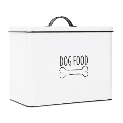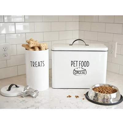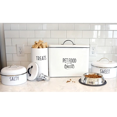 - PERSONALIZE IT FOR YOUR FAVORITE FURRY FRIEND: Our vintage pet food holder can be personalized with the cling sticker included with the purchase. This cling was designed to fit right on top of the dog bone icon. Simply write your pet’s name on the cling using a dry erase or permanent marker, then place it over the bowl art on the pet food bin. This is great for families with multiple pets with different food or treat preferences.
