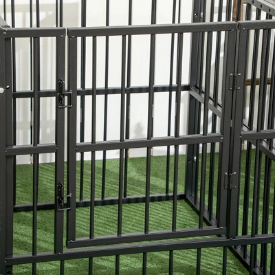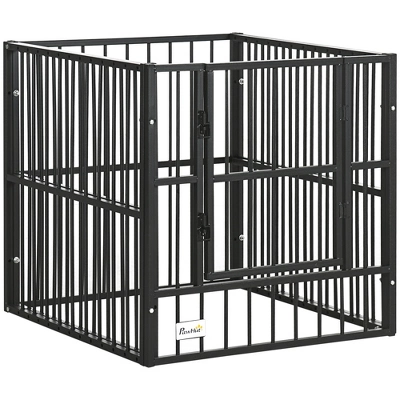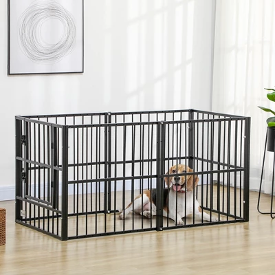 PawHut’s playpen for dogs provides a safe and controlled space for pups to play, exercise, and relax. It’s composed of 6 panels and features a size-adjustable design that can be set up in 12 ways. Its length can be changed from 33″ to 59.75″ according to your home’s layout. It can be used both indoors and outdoors and is made of heavy-duty metal, for bite-proof walls that are weather-ready. The dog kennel door allows easy in and out, featuring a lock latch set to offer safety.