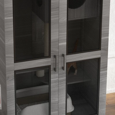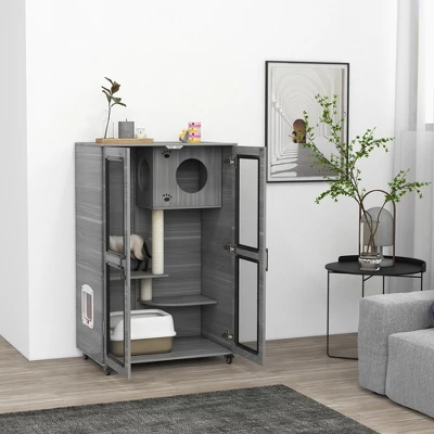 This play and nap space is built with a cabinet design that gives kitties who love to hide a hiding spot inside a hiding spot, and a dark setting to relax and play. Open up the doors to reveal a cat tower with a sleep spot that has the heights feline friends love, where a soft cushion creates a cozy environment. This PawHut furniture lets your pet climb, play, scratch, and more, while giving them a cozy, comfy, and happy experience.