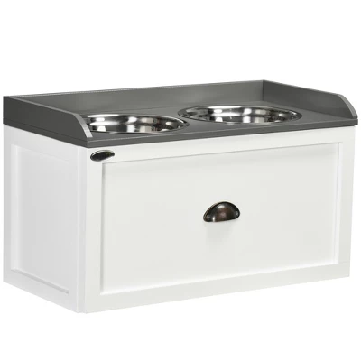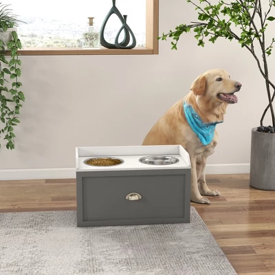 The more storage space you have, the more fun you get to give your furry friend. Chew toys, treat balls, ropes, and more can fit in this large drawer, letting you minimize the closet and shelf space used and instead organize items in the area below the food and water bowls. A PawHut raised dog bowls for large dogs ensures an angle that’s just right.