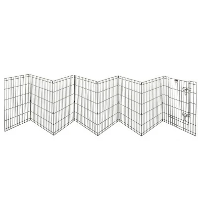 The Puppy Playpen by PETMAKER provides a great enclosure to keep your pets safe and secure indoors or out. The puppy pen has 8 connected 24-inch panels to create a spacious play area for puppies, small dogs, cats, rabbits, large turtles, or any appropriately sized pet up to 25lbs. The dog play pen is made of heavy gauge wire with a black satin electro-coat finish for long lasting protection against the elements, and it’s equipped with a secure door with double latches for easy assembly. The foldable design of this playpen for dogs allows you to set it up in multiple configurations and can fold flat for compact storage and portability.