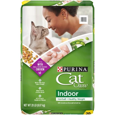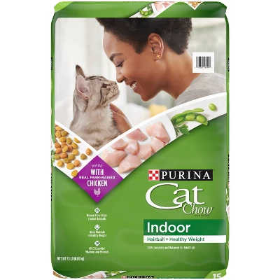 Give your indoor cat the nutrition she needs at feeding time when you serve her Purina Cat Chow Indoor adult dry cat food. Formulated with an indoor cat’s activity level in mind, this recipe contains fewer calories than Cat Chow Complete to help promote your feline friend’s healthy weight. Let her delight in the delicious taste and crunchy texture of this dry cat food, which is made with real chicken and accents of garden greens. Rest easy knowing she’s getting 100% complete and balanced nutrition for adult cats in each and every bowlful. A natural fiber blend in every serving helps control hairballs, giving you both something to feel good about at meal time. She gets a formula with high-quality ingredients to help maintain a healthy weight for her less active lifestyle. You get the satisfaction that comes from caring for her nutritional needs to help her live a long, happy life with you.