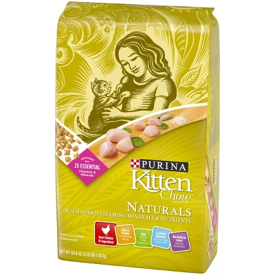 Help your kitten get the wholesome nutrition she needs to get a great start in life with Purina Kitten Chow Naturals With Added Vitamins, Minerals & Nutrients dry cat food. Containing essential nutrients like those found in mother’s milk, this recipe is made with high-quality natural ingredients plus all 25 essential vitamins and minerals to help her grow up strong. Real chicken is the #1 ingredient. High protein helps support your kitty’s developing muscles, and DHA helps promote her brain and vision development. Cats adore the great taste of Purina Kitten Chow Naturals, which contains no artificial colors, flavors or preservatives. You can also appreciate a recipe that provides 100% complete and balanced nutrition for kittens. After one year of age, begin introducing her to Purina Cat Chow Naturals Original With Real Chicken & Salmon, featuring omega 6 to promote her healthy skin and coat.