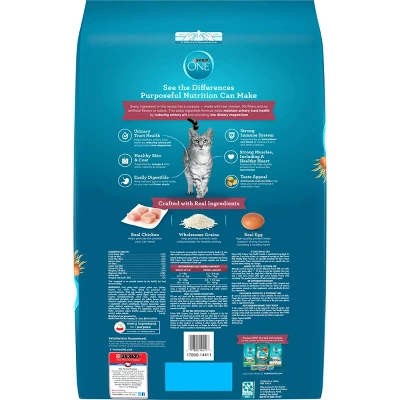 Help support your cat’s urinary tract health by feeding her Purina ONE +Plus Urinary Tract Health Formula adult dry cat food. This high protein dry cat food kibble reduces urinary pH and provides low magnesium. Our with real chicken dry cat food recipe offers delicious flavor, and this premium adult cat food contains 0 percent fillers, so all the high-quality ingredients in our easily digestible SmartBlend have a purpose. Crafted by a veterinarian-recommended brand, this urinary tract health dry cat food offers a great taste cats love and provides 100 percent complete and balanced nutrition for adult cats, including added vitamins, minerals and nutrients to promote good health. Purina ONE +Plus Urinary Tract Health Formula adult dry cat food features a crunchy kibble with added calcium that helps support her strong teeth and healthy gums. Four antioxidant sources support a strong immune system, and the high protein formula supports strong muscles, including a healthy heart. Omega-6 fatty acids in this Purina ONE Urinary Tract Health Formula adult dry cat food help promote healthy skin and a soft, luxurious coat to make the time you share together even more enjoyable.