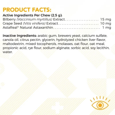 It’s no secret that your dog’s eyesight can deteriorate with age. Age-related vision issues may include cloudy eyes, squinting, discharge and beyond. Clear & Bright features powerful antioxidants to help maintain your pup’s eye health and vision as they get older. AstaReal Natural Astaxanthin is a carotenoid that may help with cloudy eyes due to lens deterioration. Grape Seed Extract is a potent antioxidant that helps prevent oxidative damage while Bilberry Extract promotes healthy eye tissue and structure for optimal vision. These ingredients come in a tasty chicken liver-flavored chew that can help your dog see the world with fresh eyes!